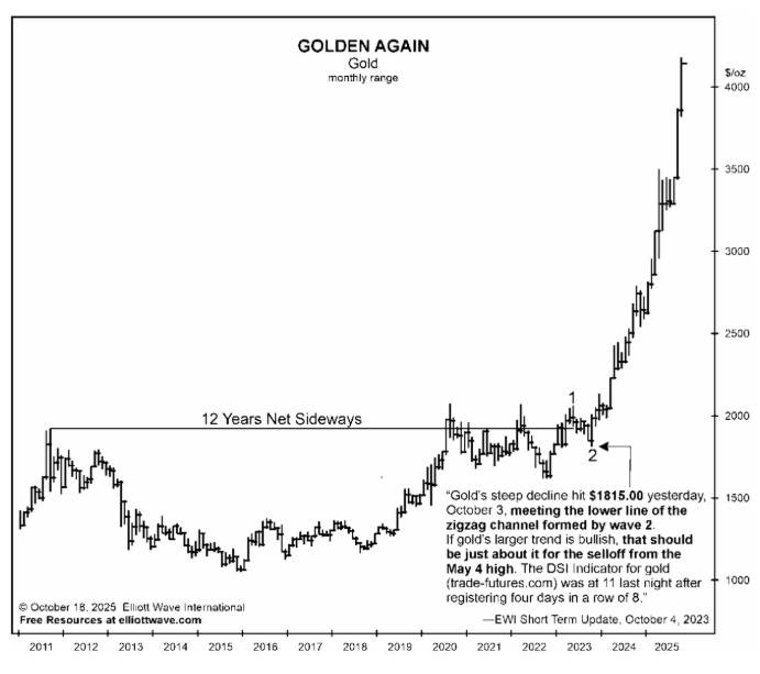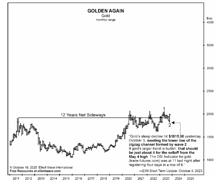On September 29, 2023, after 12 years of net sideways movement in gold, our Elliott Wave Financial Forecast focused subscribers on the “approaching wave 2 low”– which meant a powerful wave 3 rally was about to begin.