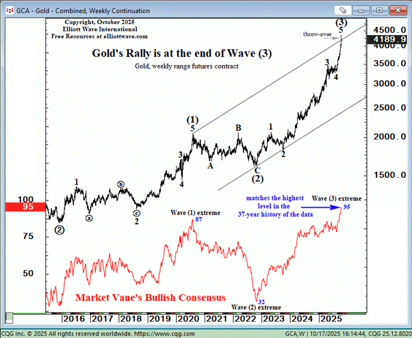 We remained patiently bullish for two long years until October 17, 2025 when our Short Term Update stated unequivocally, “Gold’s Rally is at the end of Wave (3).”